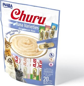 Inaba Churu Tuna Recipe Lickable Purée Natural Cat Treats, sold in 3-packs, each containing four tubes, cost $11.97 on Amazon.com. The churu treats are also available in larger packs with some cost savings.