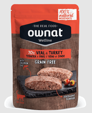- Ownat Wetline is 100 percent natural, with high percentages of fresh meat and fish. These foods are grain-free and slow-cooked in their own juices. They contain no artificial coloring or preservatives. Current offerings include sterilized chicken & turkey, sterilized chicken & salmon, and sterilized turkey & tuna; veal & turkey, chicken & shrimps, turkey & chicken, kitten salmon & turkey, and salmon & herring. These recipes are sold in pouches and cans.