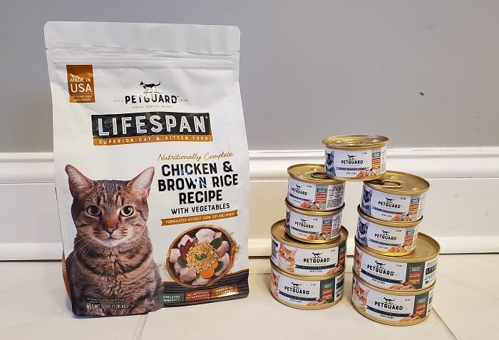 To test PetGuard cat food, we ordered a bag of their LifeSpan Chicken & Brown Rice Recipe with Vegetables dry food and an assortment of canned foods.