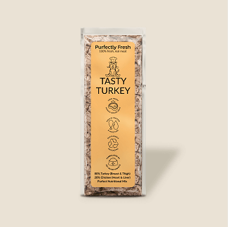 - The Tasty Turkey is made from 80 percent turkey thigh, 20 percent chicken heart and chicken liver.