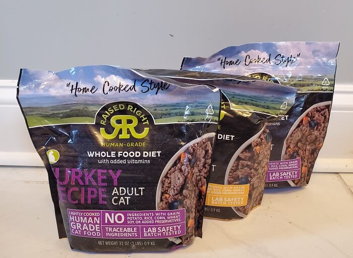 Raised Right is a fresh pet food company that only offers their products online. Their foods are sold in 16-ounce bags and delivered frozen. Every Raised Right recipe is made with a single source of animal protein, either chicken or turkey.
