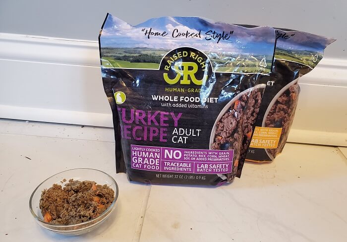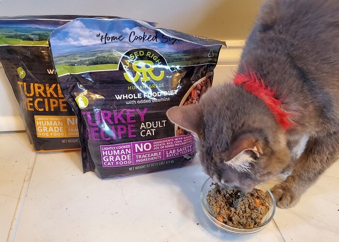 Raised Right offers two recipes for human-grade, single-source protein cat food: chicken and turkey. Kate Barrington / Cats.com