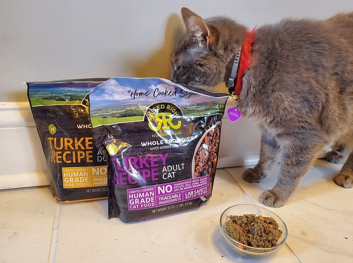 I bought the turkey recipe. What a pity – the spearmint kills an otherwise great recipe, my cat normally loves dark poultry meats (turkey/chicken thighs) but she didn’t take one bite of the RR turkey food. As soon as I defrosted and opened the bag, the smell of spearmint was obvious. The company really ought to consider a substitute for spearmint, it’s a shame but the ingredients besides the spearmint are terrific. I too searched for cat reviews and went through many of the reviews on the website and couldn’t find any cat reviews, no wonder.