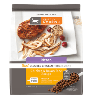 | Simply Nourish Chicken & Brown Rice Kitten Food | Dry | $0.13 per oz | B- |