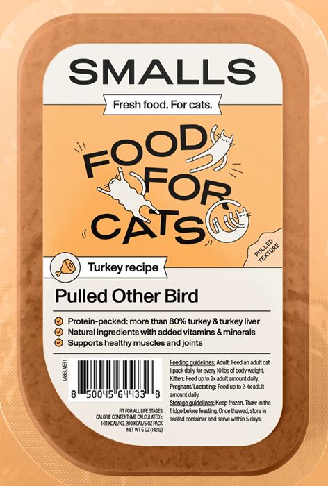 The Smalls fresh food lineup has changed several times over the years, most recently with a reformulation that significantly reduced the products’ carbohydrate content. The brand added its first multi-protein recipe in 2024 (Smooth Bird & Fish Dish) along with two shredded recipes (Pulled Bird and Pulled Other Bird). The pulled recipes and beef-based formulas are considered “premium” options and cost an extra $0.50 per packet.