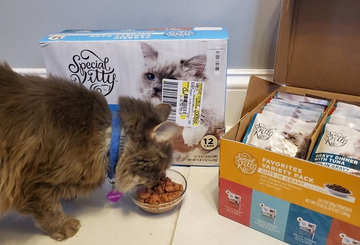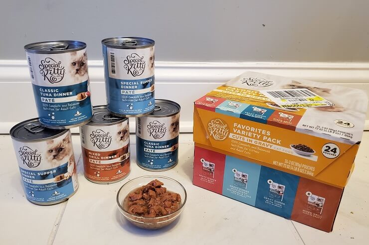 The first thing we noticed about Special Kitty products was, of course, the price. Both variety packs were priced under $10 for twelve 13-ounce cans and 24 three-ounce pouches. The dry food was priced under $4 for a 3.5-pound or 3.15-pound bag.
