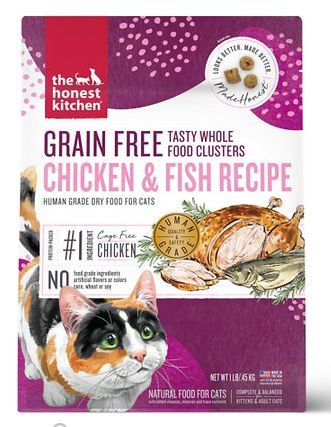 | The Honest Kitchen Whole Food Clusters Grain-Free Chicken & Fish Dry Cat Food | Dry | $0.5 per oz | B- |
