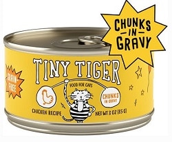 | Tiny Tiger Chunks in Gravy Chicken Recipe Grain-Free Canned Cat Food | Wet/Canned | $0.26 per oz | C+ |